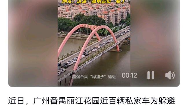 近日,广州番禺丽江花园的业主们为了躲避台风“桦加沙”,将近百辆私家车停放在小区内部的丽江大桥上。车辆排列成2-3排,单向保留了一条车道供通行。这一做法在网络上引起热议,被称为“高地占位”