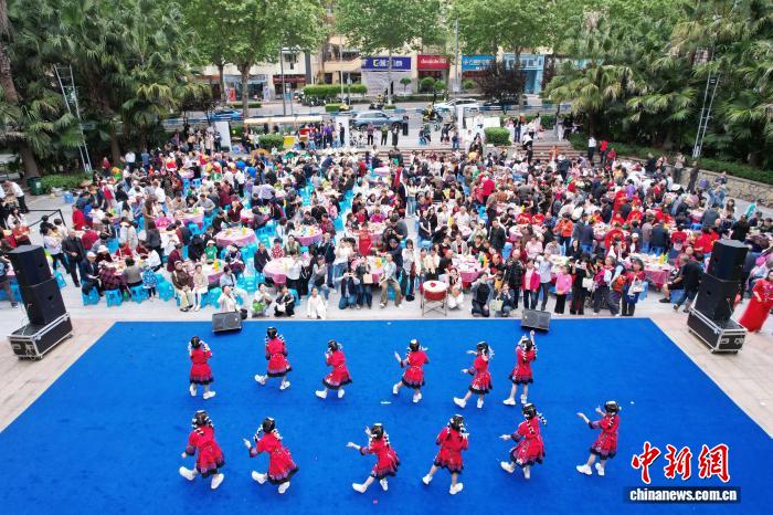 图为百家宴现场,居民边品尝美食边看文艺演出。陈鑫 摄 图为百家宴现场,居民围坐品尝美食。陈鑫 摄
