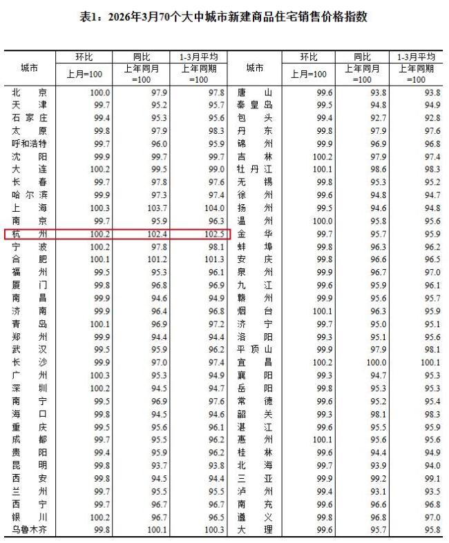 国家统计局公布了3月70个大中城市的价格变动情况。杭州3月新房价格环比上涨0.2%,与上月持平;同比上涨2.4%,较上月收窄。二手房价格环比下跌0.1%,跌幅略有缩小;同比下跌5.2%,跌幅继续扩大