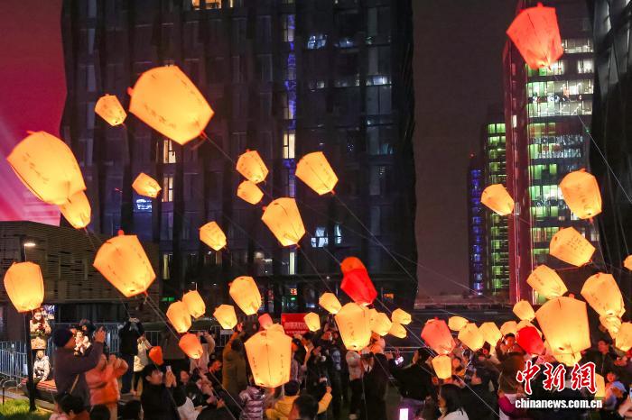 3月3日晚,江苏南京,市民“放飞”孔明灯。中新社记者 泱波 摄 3月3日晚,江苏南京,演员们手举鱼灯在点亮的飞马彩灯前巡游。中新社记者 泱波 摄
