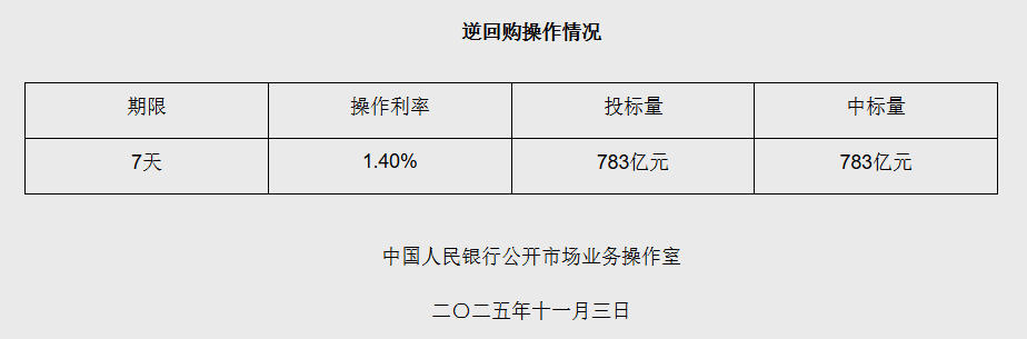 中新网11月3日电 据央行网站消息,2025年11月3日中国人民银行以固定利率、数量招标方式开展了783亿元7天期逆回购操作。具体情况如下: