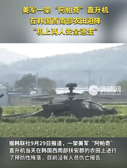 美军一直升机在韩预防性降落。据韩联社9月29日报道,一架美军“阿帕奇”直升机当天在韩国西南部扶安郡的农田上进行了预防性降落,目前没有人员伤亡报告。当地时间9月29日,一架美军“阿帕奇”直升机在韩国西南部预防性降落。报道称,美国陆军第二步兵师...