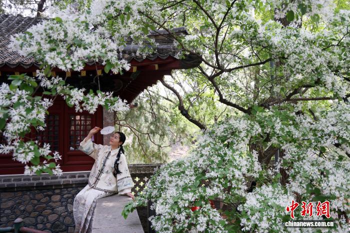 4月15日,泰山王母池百年流苏古树迎来盛花期,吸引游客“打卡” 。陈阳 摄