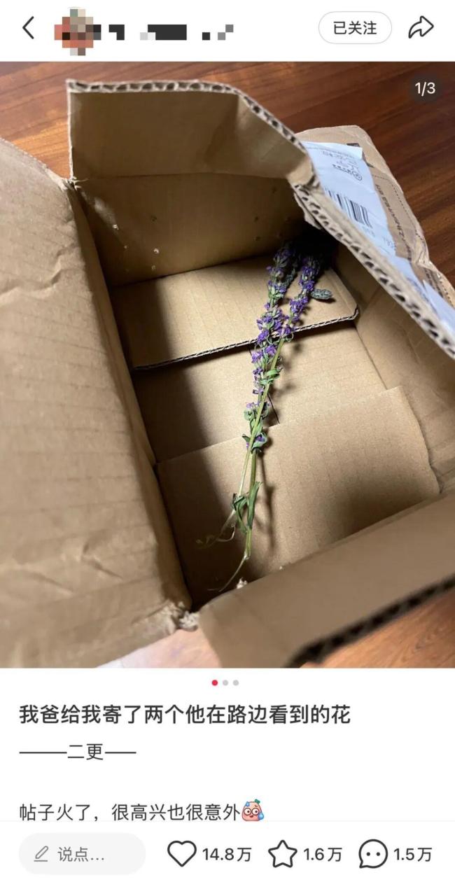 近日,一名网友分享了爸爸寄来的两支野花,引发网友热议。这两朵已经变成干花的小野花孤零零地躺在快递盒里,“可怜”却又可爱。这名网友提到,自己原本并未想到这会被称作“浪漫”的事,只是觉得自家“老爹”笨拙得可爱