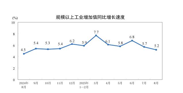 国家统计局:8月份规模以上工业增加值增长5.2%