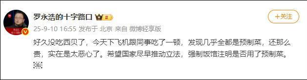9月10日下午,罗永浩在微博吐槽西贝用预制菜,并且希望国家尽早推动立法,强制饭馆注明是否用了预制菜。