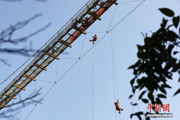 图为活动现场模拟垂直救援。周琚琛 摄 图为消防员利用绳索垂降“事故现场”。覃坤林 摄