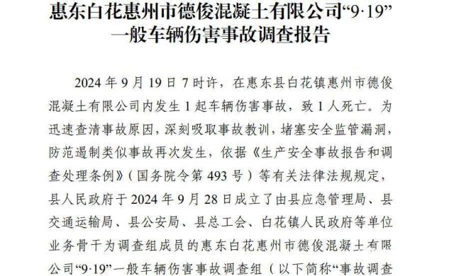 近日,惠州市惠东县应急管理局发布了《惠东白花惠州市德俊混凝土有限公司“9·19”一般车辆伤害事故调查报告》,详细说明了这起场内洒水车溜坡致人死亡的事件